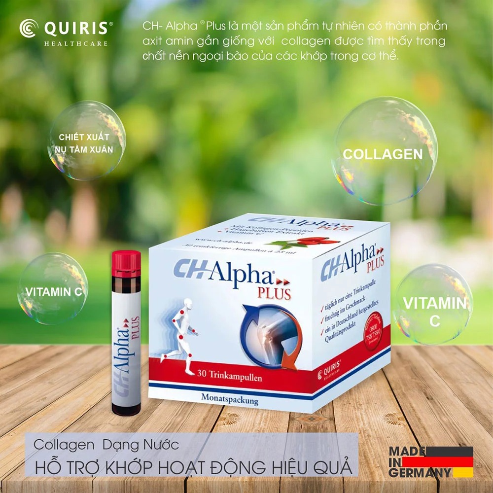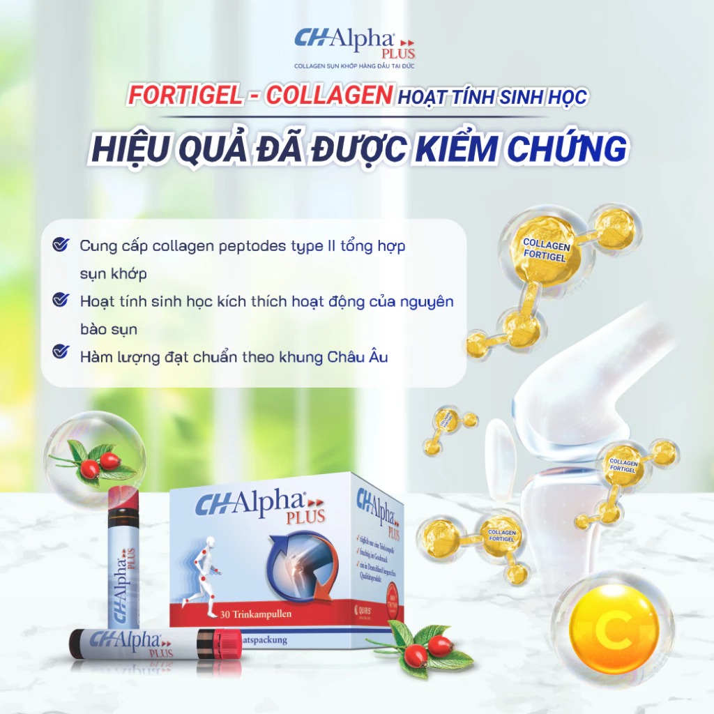 CH Alpha Plus là dạng collagen cao cấp đến từ Đức, được thiết kế đặc biệt nhằm hỗ trợ sụn khớp hiệu quả. Sản phẩm kết hợp Collagen FORTIGEL® cùng các dưỡng chất tự nhiên như chiết xuất tầm xuân và vitamin C, hỗ trợ tái tạo sụn khớp, giảm nguy cơ viêm và thoái hóa khớp. Đặc biệt, sản phẩm hoàn toàn không chứa cồn, gluten, Purine hay lactose, an toàn cho mọi đối tượng.