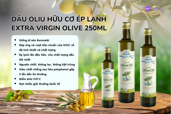 Dầu Olive hữu cơ ép lạnh Extra Virgin Olive tại MHC VitaPlus được ép lạnh từ giống Koroneiki trứ danh của Hy Lạp, giàu polyphenol và vitamin E, giúp chống viêm, giảm stress oxy hóa và bảo vệ sức khỏe tim mạch.