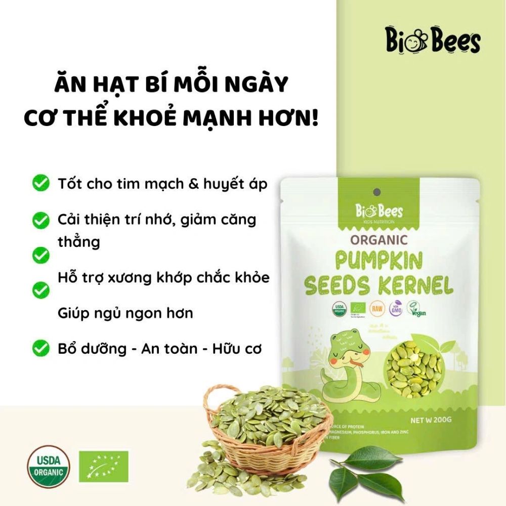 Hạt bí xanh hữu cơ Bio Bees được thu hoạch từ quả bí ngô canh tác theo phương pháp hữu cơ, không sử dụng hóa chất, không biến đổi gen (Non-GMO). Đây là siêu thực phẩm giàu dưỡng chất, an toàn cho sức khỏe và phù hợp với nhiều chế độ ăn uống hiện đại.